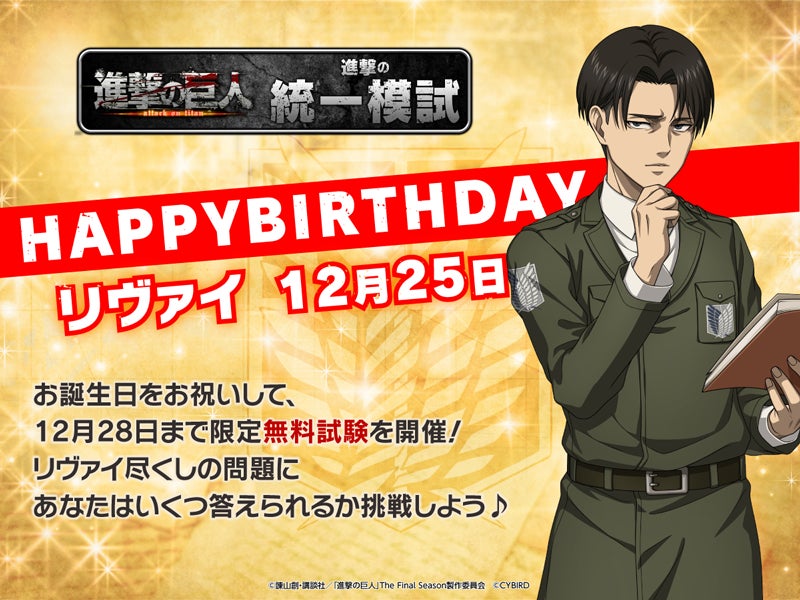 「進撃の統一模試」リヴァイ誕生日記念コース無料開催決定!セリフ入りメモ帳が当たるプレゼントキャンペーン実施中!