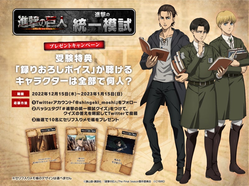 2022年12月15日(木)から2023年1月15日(日)までの期間、セリフ入りメモ帳が当たるプレゼントキャンペーンを実施しています。「進撃の統一模試」公式Twitterをフォローし、ハッシュタグ「#進撃の統一模試クイズ」を使用してクイズの答えをツイートした方の中から抽選で10名様にプレゼントします。
