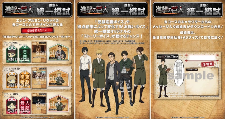 受験することで、もれなく「受験応援3点セット」をプレゼントします。「進撃の統一模試」のための新規描きおろしデザインを使用した「応援お守り・セリフ入りメモ帳・絵馬型アクリルキーホルダー」の3点セットとなっています。「成績表(リアル&デジタル)」と「録りおろしボイス」も受験者の皆様にプレゼントします。