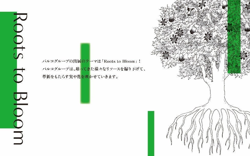 テーマである「Roots to Bloom」にちなみ、各社の強みを円筒(枝木)に見立て、それぞれの要素が更に拡張していくイメージを表現しています。