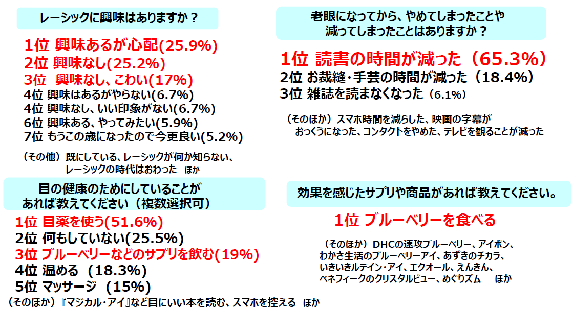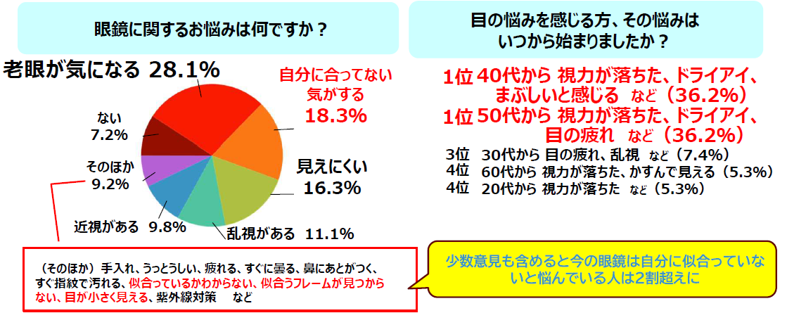 アンケート結果によると、悩みのトップは「老眼」、ほぼ同数で「疲れ目」が挙げられ、そのほか「近視」「ドライアイ」「乱視」など悩みが複雑・多様化していることが判明。また、それにより本を読む・スマホを見る・運転するときなど日常生活に支障が出ていることもわかりました。