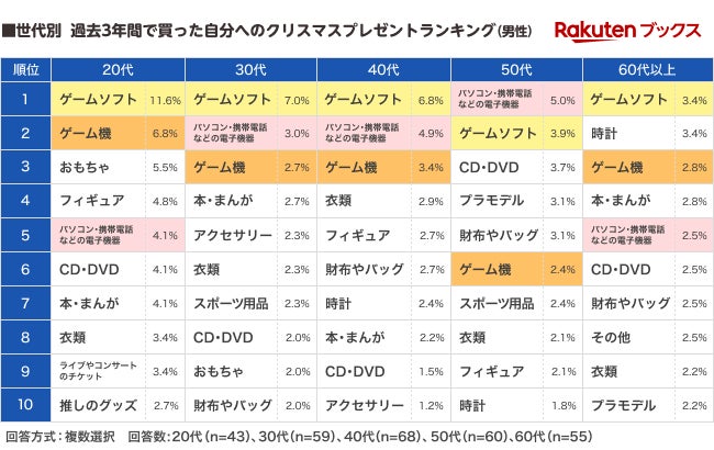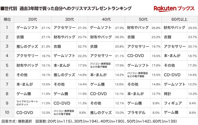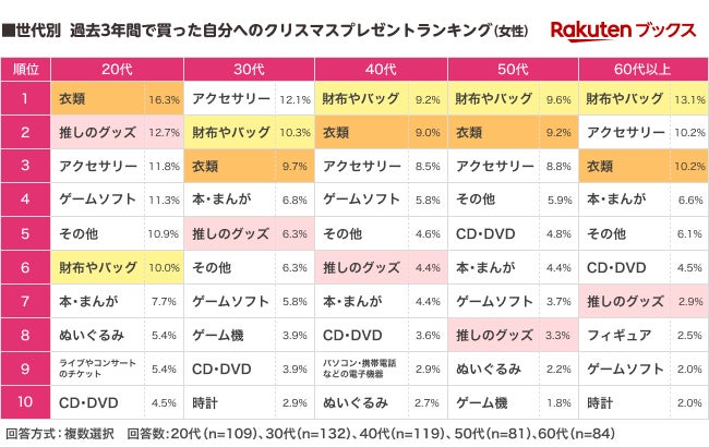 過去3年以内に自分へのクリスマスプレゼントを買ったことがあるか聞いたところ、約2割のユーザーが「はい」と回答しました。買ったプレゼントの内訳としては、「ゲームソフト」や「財布やバッグ」「衣類」などが上位に挙がりました。男性は「ゲームソフト」に加え、「パソコン・携帯電話などの電子機器」「ゲーム機」が人気で、女性は「財布やバッグ」「衣類」が人気ということがわかりました。また、女性の各年代ではトップ10に「推しのグッズ」がランクインしました。