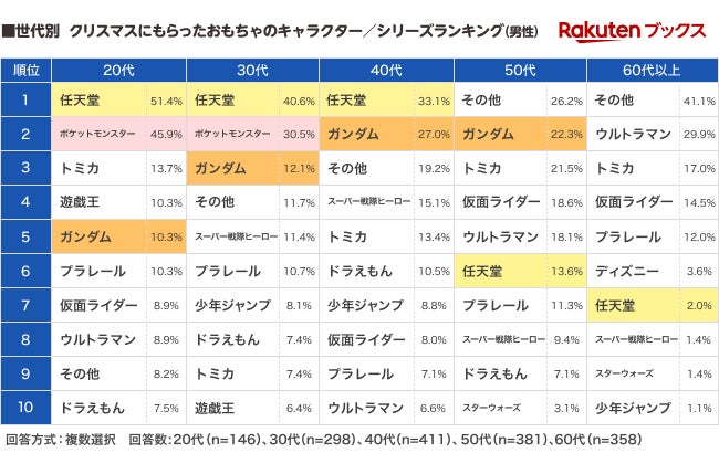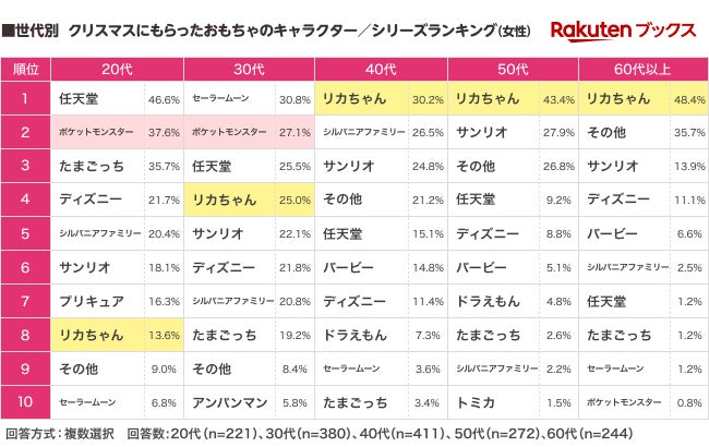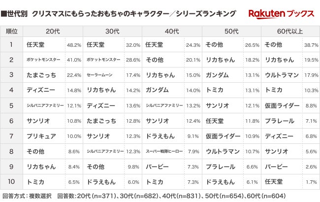 クリスマスにもらったおもちゃのキャラクター/シリーズを聞いたところ、20代から40代では「任天堂」が1位の結果になりました。また、20代と30代では、「ポケットモンスター」が2位にランクインしました。男性では「ガンダム」が20代から50代でそれぞれトップ5入りし、幅広い世代で人気を集めていたことがうかがえます。女性のランキング上位には、「リカちゃん」が全年代でランクインし、40代から60代以上では1位という結果になりました。