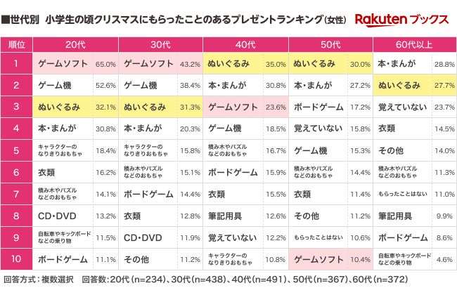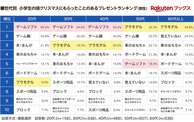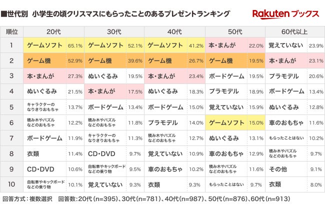 小学生の頃にもらったことのあるクリスマスプレゼントを年代に分けて聞いたところ、20代から40代で「ゲームソフト」がそれぞれ1位という結果になりました。また、20代から50代までで「ゲーム機」が2位であったほか、「本・まんが」はどの年代でも上位にランクインしました。男性では「プラモデル」がどの年代でも10位以内にランクインし、50代と60代以上においては1位を獲得したことから、年齢が上がるにつれて人気であったことがわかりました。女性は、各年代で「ぬいぐるみ」がランクインし、40代・50代では1位、60代以上では2位となりました。