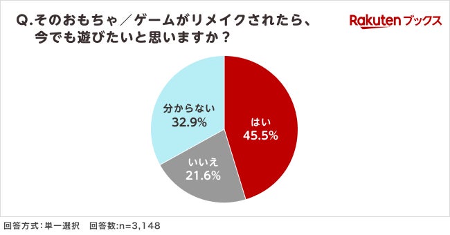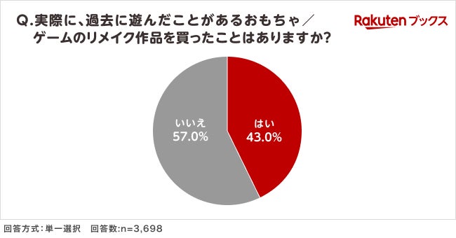 また、上記で答えた思い出に残っているおもちゃがリメイクされたら今でも遊びたいと思うかという質問には、4割以上のユーザーが「はい」と回答しました。実際に過去に遊んだことがあるおもちゃやゲームのリメイク作品を買ったことがあるユーザーは約4割で、子どもの頃に遊んだおもちゃやゲームを大人になってからも遊びたいという「キダルト」(注)需要がうかがえました。