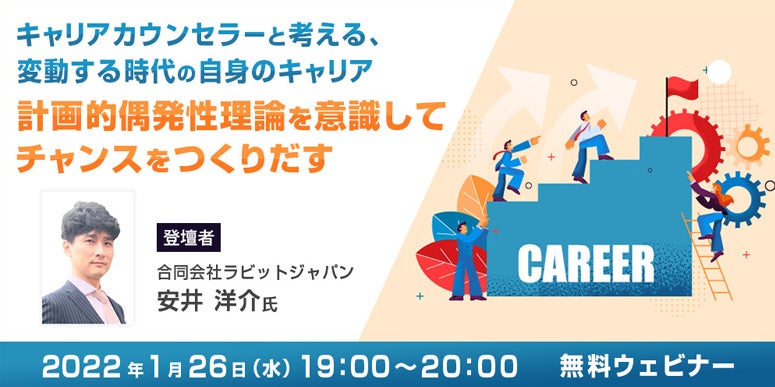 株式会社クリーク・アンド・リバー社(C&R社)は1月26日(水)、クリエイターの方々を対象に、キャリアカウンセラーと一緒にご自身のキャリアを形成を考えるオンラインセミナー「計画的偶発性理論を意識してチャンスをつくりだす」を開催いたします。