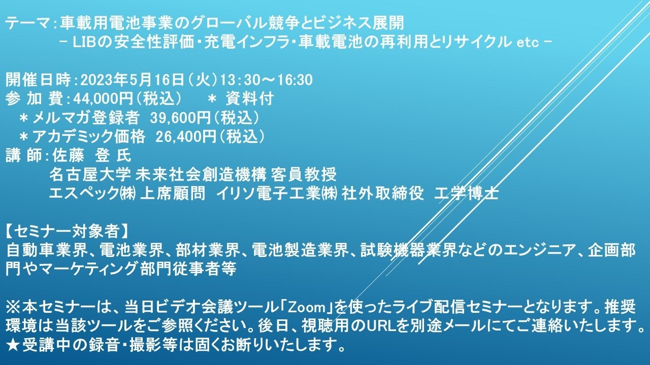 先端技術情報や市場情報を提供している(株)シーエムシー・リサーチ(千代田区神田錦町: https://cmcre.com/ )では、 各種材料・化学品などの市場動向・技術動向のセミナーや書籍発行を行っておりますが、 このたび「車載用電池事業のグローバル競争とビジネス展開– LIBの安全性評価・充電インフラ・車載電池の再利用とリサイクル etc –」と題するセミナーを、 講師に佐藤 登 氏 (名古屋大学 未来社会創造機構 客員教授エスペック(株) 上席顧問 イリソ電子工業(株) 社外取締役 工学博士)をお迎えし、2023年5月16日(火)13:30より、 ZOOMを利用したライブ配信で開催いたします。 受講料は、 一般:44,000円(税込)、 弊社メルマガ会員:39,600円(税込)、 アカデミック価格は26,400円(税込)となっております(資料付)。