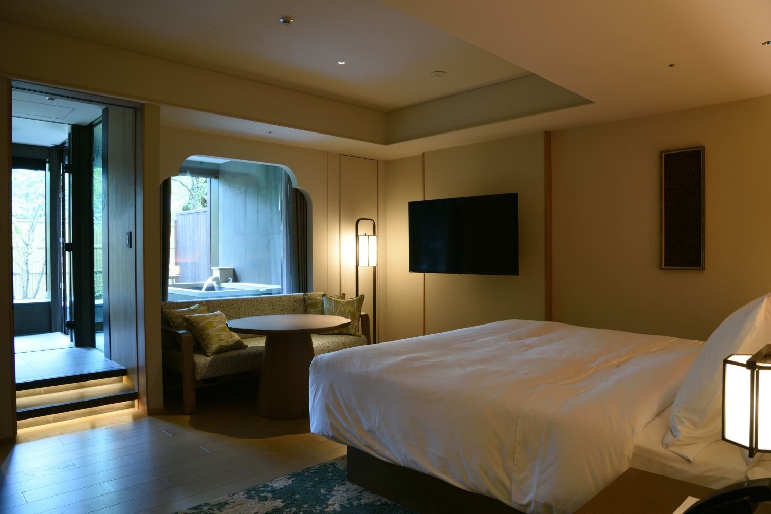 『紫翠 ラグジュアリーコレクションホテル 奈良』(奈良市)のデラックスキングルーム。市内から運び入れた温泉の露天風呂が付く。