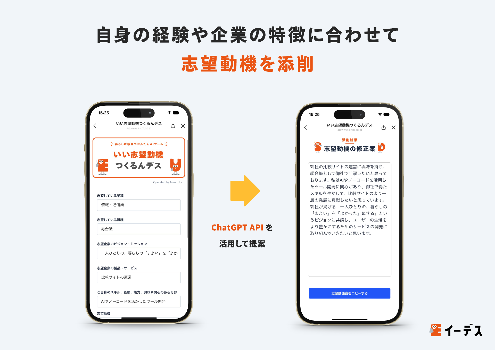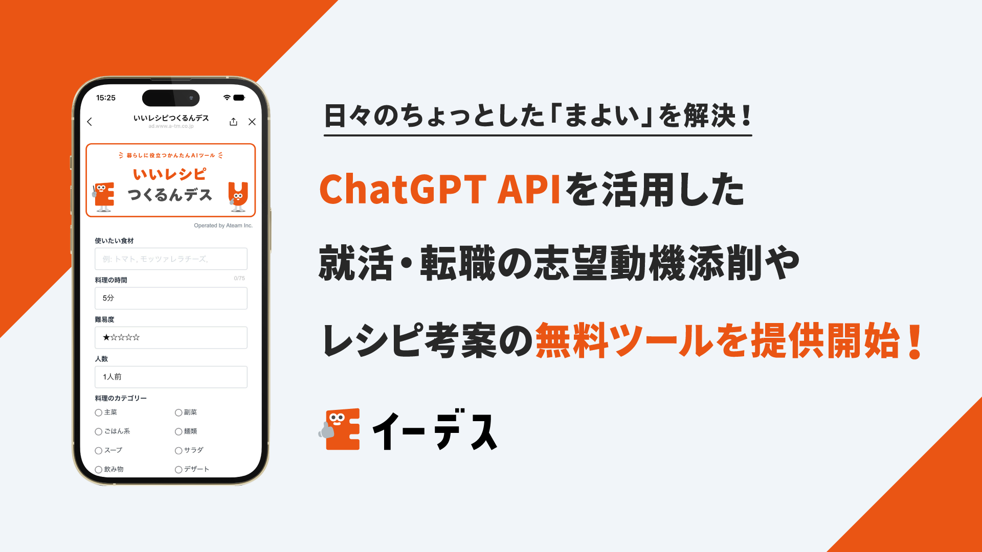 イーデスでは、「いいレシピつくるんデス」と「いい志望動機つくるんデス」を新たに提供するにあたり、ChatGPT APIを活用したツールをより安心して使っていただけるよう利用規約を改定しました。(https://www.a-tm.co.jp/top/user_policy/)