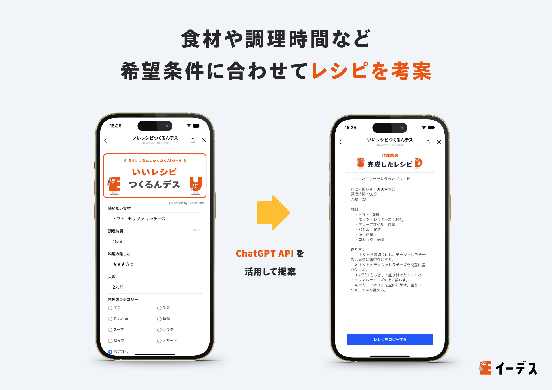「いいレシピつくるんデス」・「いい志望動機つくるんデス」は、OpenAIのChatGPT APIを活用した、暮らしやライフイベントで生まれる“相談するほどでもないけれど日常生活で悩みがちな迷い”を解決できるツールです。