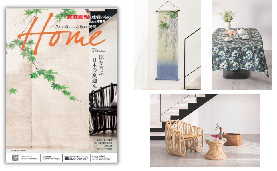 インテリアカタログ『HOME』では、「涼を呼ぶ日本の夏迎え」と題し、涼やかな暮らしを演出する家具やインテリア、住まいの雑貨を大特集。名工のラタン家具や天然素材のラグなど、夏のお気に入りがきっと見つかります。お出かけが楽しくなるバッグやアクセサリーを集めた「才色兼備な夏の小物」、これからの時季に必須の便利品が目白押しの「紫外線と暑さ対策」、健やかな美をサポートする「夏のビューティ」など、暮らしのあらゆるシーンを豊かに心地よく彩る商品を揃えました。
