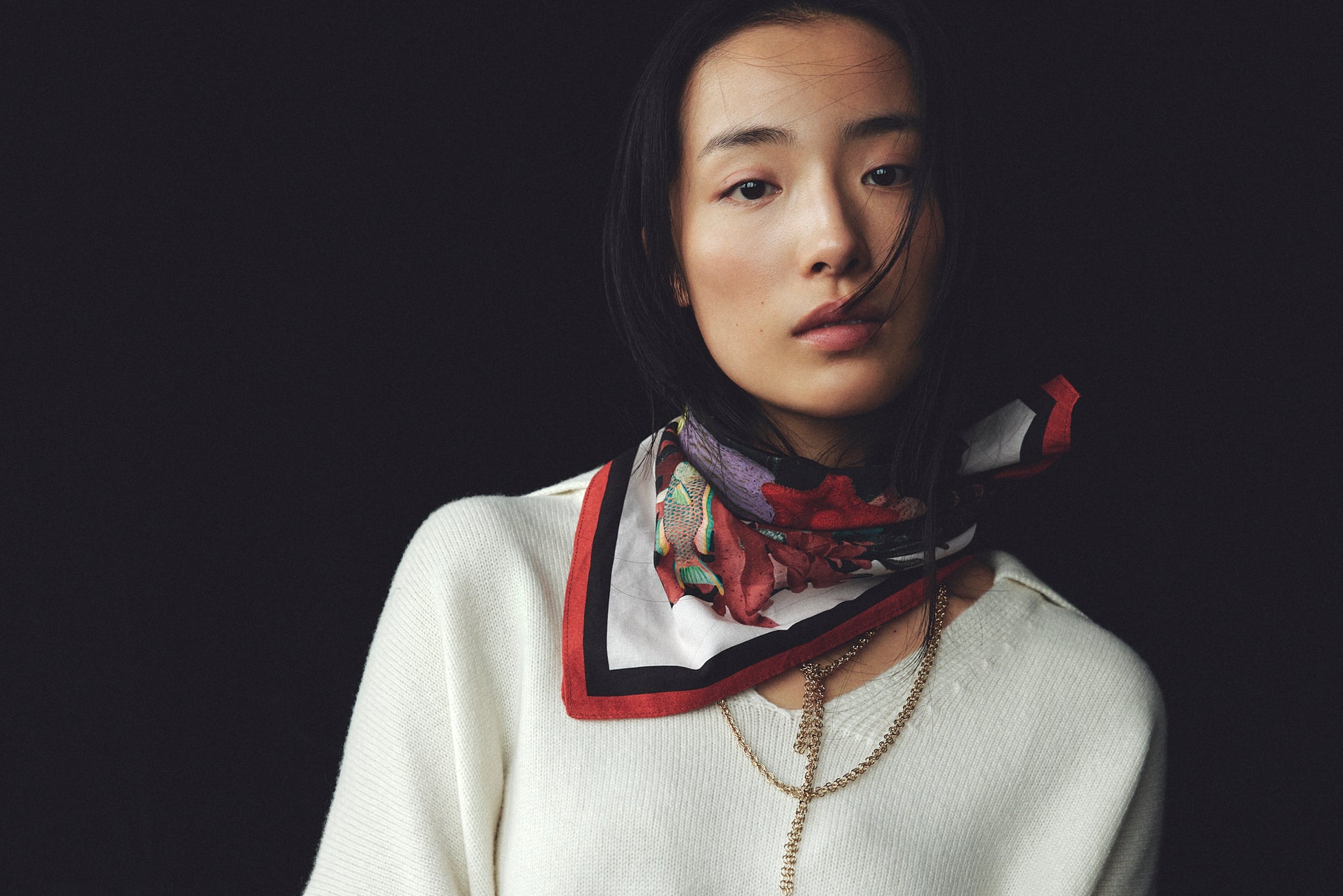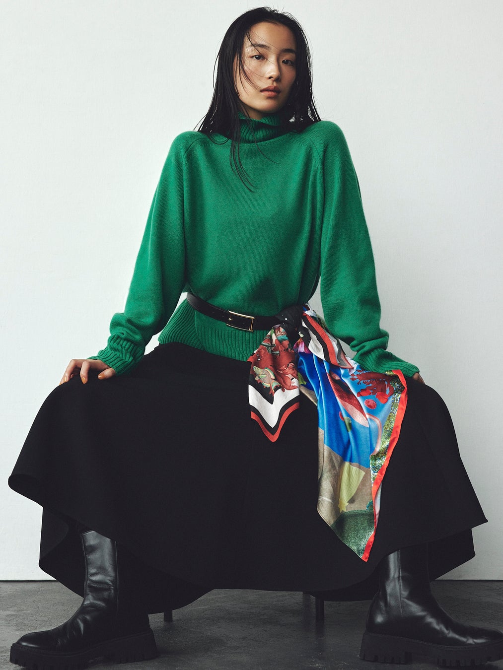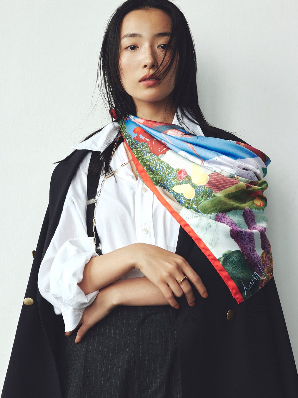 大判だからこそ、一枚でコーディネートが華やぐような柄と素材に、