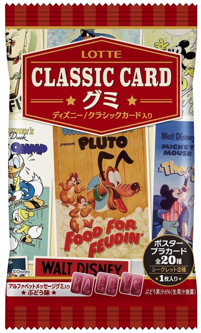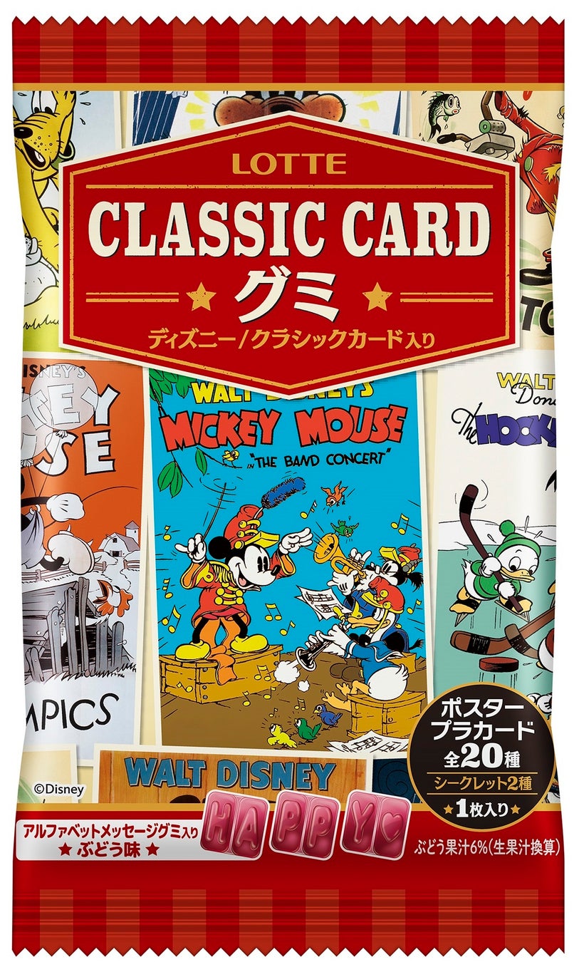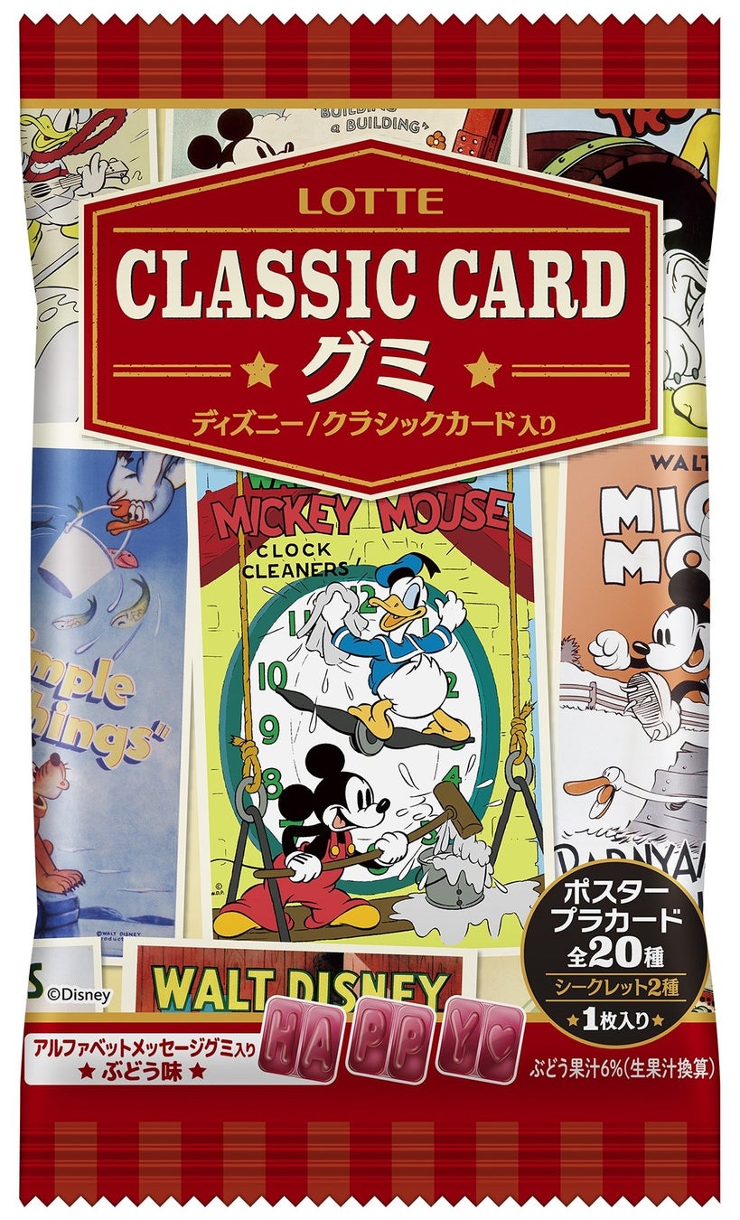 株式会社ロッテは9月24日(火)に「Disney/クラシックカードグミ<ぶどう>」を発売します。本品にはアルファベット型がかわいいぶどう味のグミと、ついつい集めたくなる、レトロかわいい、クラシックなディズニーアートが描かれたカードが1枚入っています。アルファベット型のグミは「SMILES」「THANKS」などの元気が出る単語になっていて、全種類集めるとアルファベット26文字をそろえることができます!グミを味わうだけではなく、見たり、並べ替えたりしてもお楽しみいただけます。ご家族やご友人と一緒にぜひお楽しみください!
