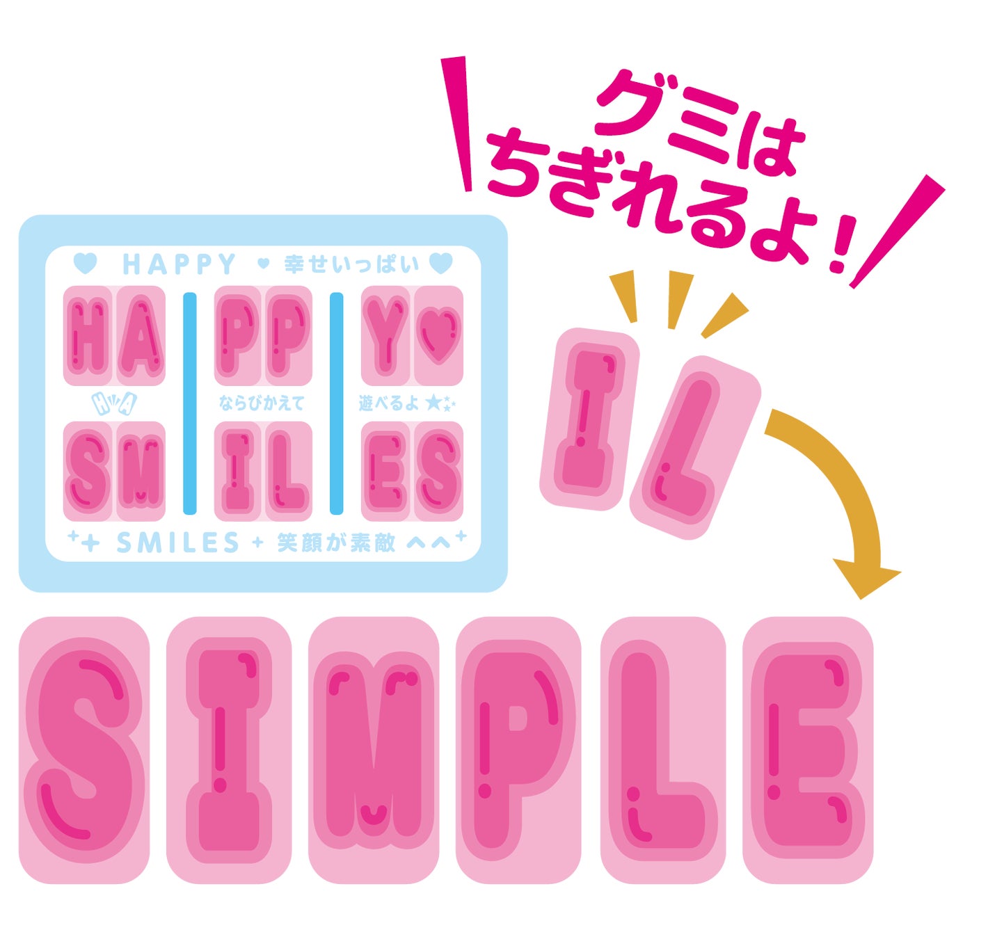 グミはアルファベット型で、並べてみると「SMILES」「THANKS」などの元気がでるような明るい単語になります。また、全種類集めるとアルファベット26文字をそろえることができます。