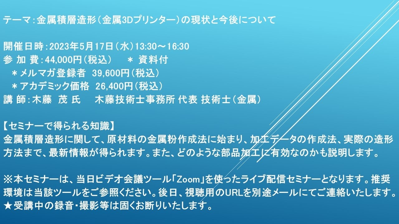 【ライブ配信セミナー】金属積層造形(金属3Dプリンター)の現状と今後について 5月17日(水)開催 主催:(株)シーエムシー・リサーチ