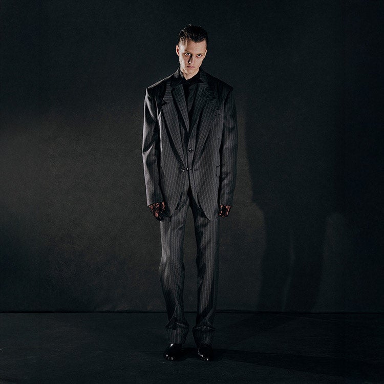 セットアップのトラウザーズはゆったりとしたワイドストレートシルエットで、インタックのシャープな腰まわりが特徴的。