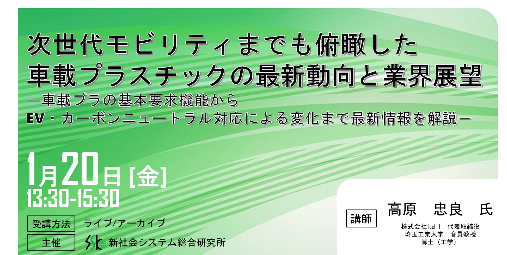 「車載プラスチックの最新動向と業界展望」と題して、株式会社Tech-T 代表取締役/埼玉工業大学 客員教授 博士(工学) 高原 忠良氏のセミナーを2023年1月20日(金)に開催!!