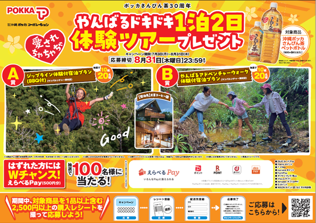 最後に、より沖縄のよさや魅力の発見につながるよう、「やんばるドキドキ1泊2日体験ツアープレゼントキャンペーン」を実施します。やんばるの豊かな自然を満喫していただき、「元祖 沖縄ポッカさんぴん茶」とともに、思い出に残るツアーを企画しました。ぜひ、この機会にご応募下さい。