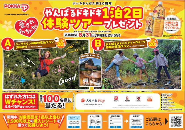 やんばるの自然豊かな環境に触れる事ができるキャンペーンです。Wチャンスとして「えらべるPAY」500円分が100名様に当たります。キャンペーン詳細は、以下のキャンペーンサイトよりご確認下さい。