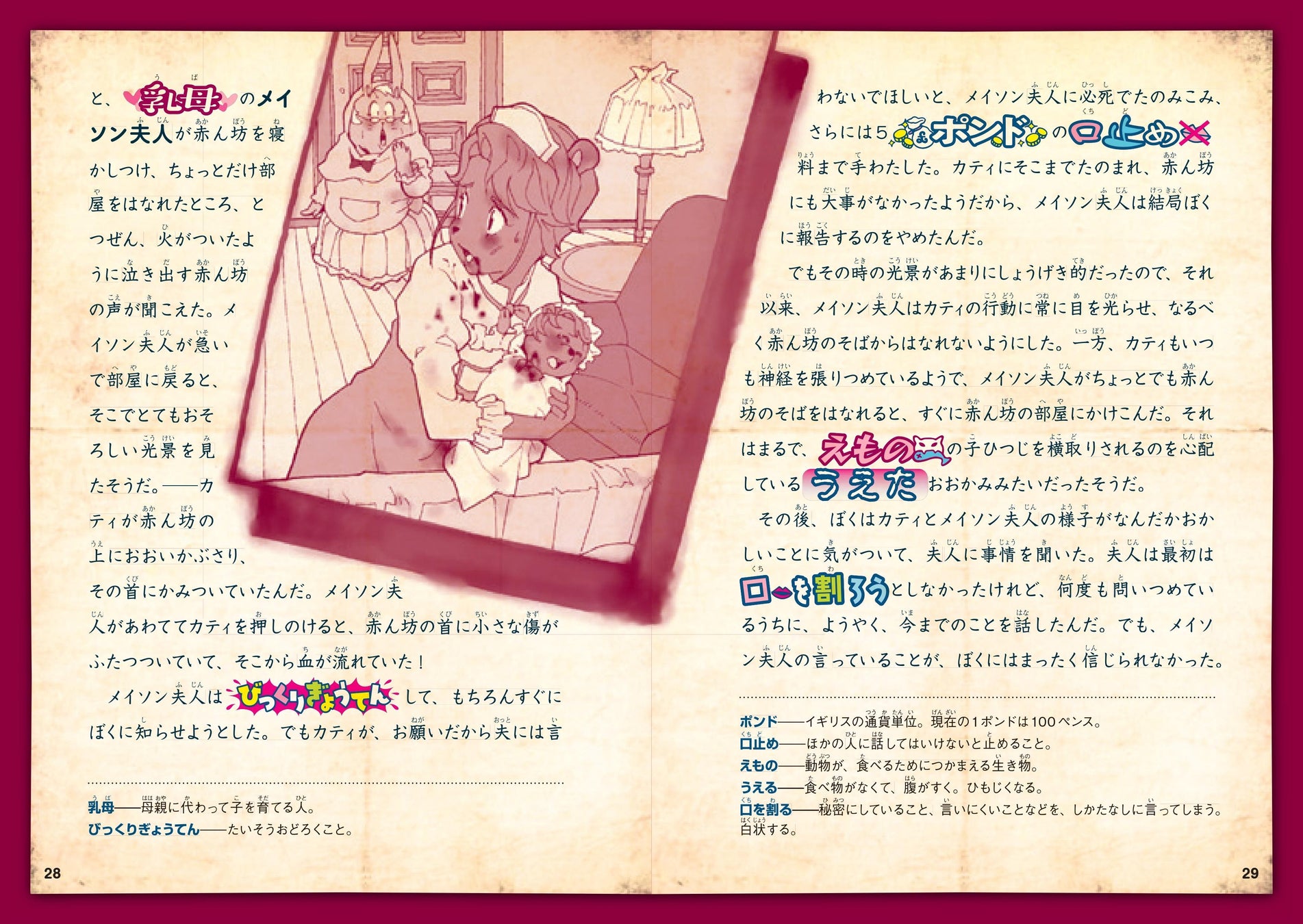 今回は、小学生が大好きな“吸血鬼”がテーマ。名探偵シャーロック・ホームズの元に、妻がわが子の首から血を吸っているのを目撃した男から、事件解決の依頼が届きます。さぁ、ホームズはこのなぞをどう解くのでしょうか!?(原作/コナン・ドイル「サセックスの吸血鬼」)
