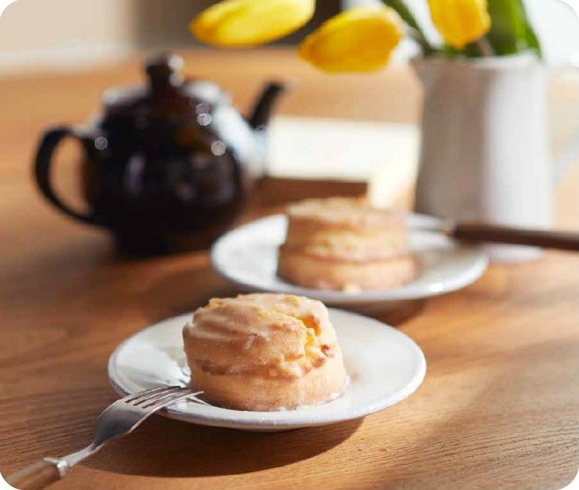 「焼き菓子は焼きたてこそ楽しんでほしい」という想いを持つパティシエの坂下寛志さんが、このイベントのために作ったスペシャルなレモンのスコーン。レモンが軽やかに香る生地にレモン風味のアーモンドクリームを挟んで焼き上げ、レモンピールを入れたレモン果汁たっぷりのグラスアローでコーティング。オレンジやパッションフルーツも入って、より一層フルーツ感が増した華やかな味わいに。