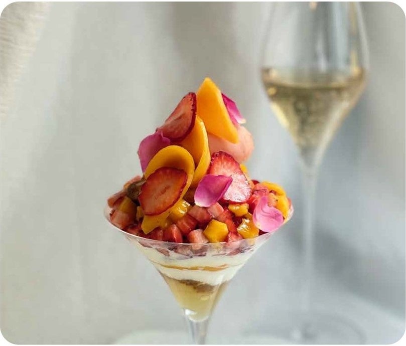 フランス発本格レストランガイド「ゴ・エ・ミヨ2023」でベストパティシエ賞を受賞した延命寺美也さんとソムリエの信一さん夫婦が営む、アシェットデセールとワインバーのお店。旬を迎えたこの時期にしか出会わないマンゴーといちごを合わせた一期一会で華やかなパフェ。