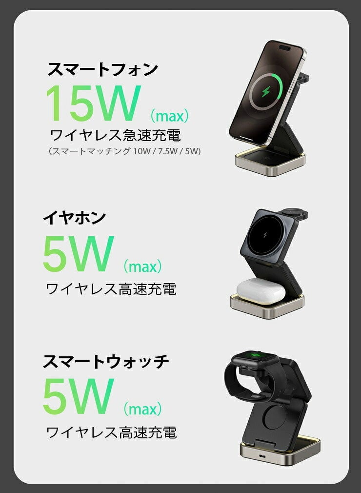 15W(スマートフォン)/ 5W(スマートウォッチ)/ 5W(イヤホン) |