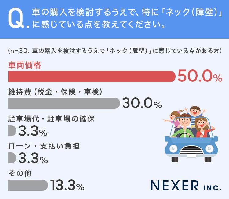 最も多かったのは「車両価格」で50.0%で、半数の人が車両本体の価格をネックに感じています。次いで「維持費(税金・保険・車検)」が30.0%、「駐車場代・駐車場の確保」と「ローン・支払い負担」がそれぞれ3.3%でした。