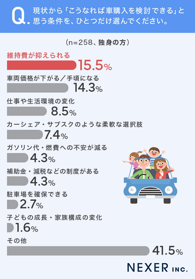 独身の方は「維持費が抑えられる」が15.5%、「車両価格が下がる/手頃になる」が14.3%で、ほぼ同じ割合となっています。