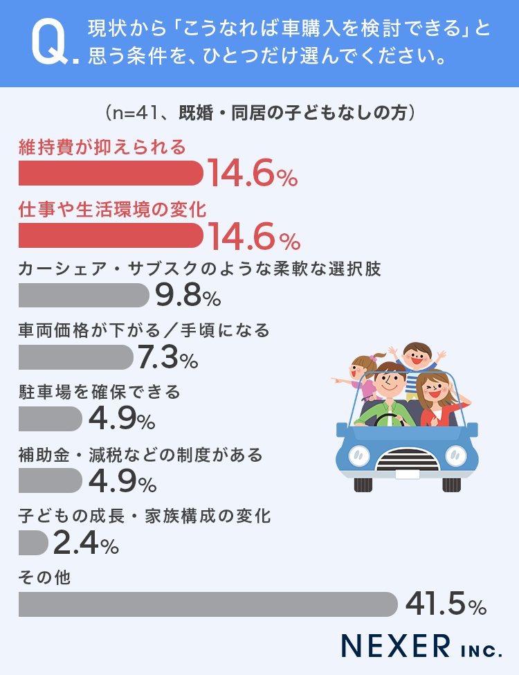 「維持費が抑えられる」が24.4%と、ほかの家族構成に比べて突出して高い割合を示しました。「車両価格が下がる/手頃になる」と「仕事や生活環境の変化」がそれぞれ9.8%と続いています。