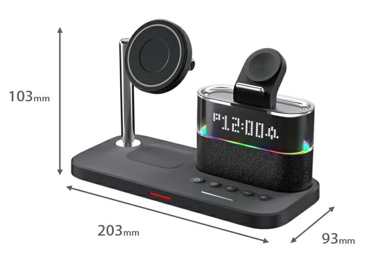 EnerDockはスマートフォン、スマートウォッチ、イヤホンのワイヤレス充電機能、アラーム機能付きのデジタル時計、LED照明機能、の5つの機能がひとつになった多機能充電器。