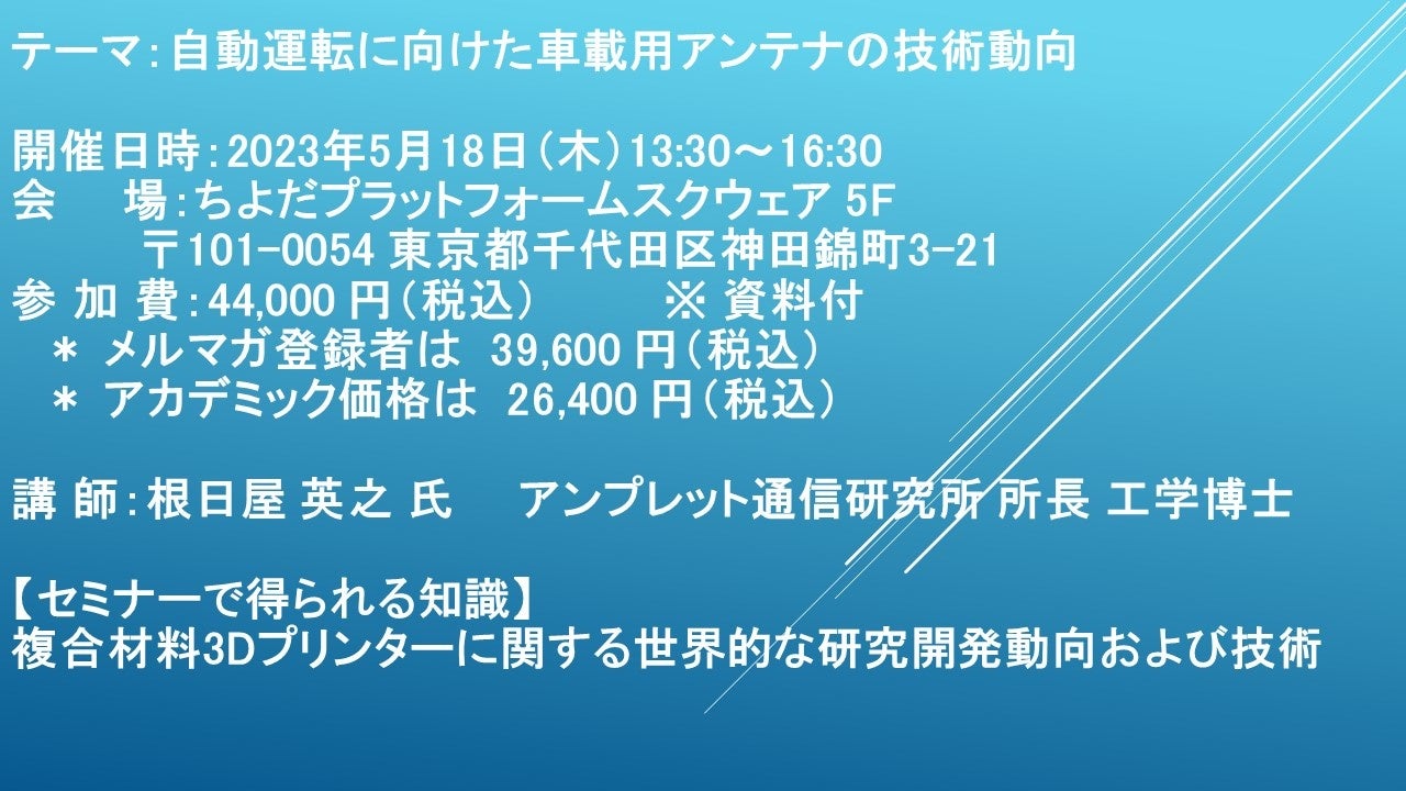 先端技術情報や市場情報を提供している(株)シーエムシー・リサーチ(千代田区神田錦町: https://cmcre.com/ )では、 各種材料・化学品などの市場動向・技術動向のセミナーや書籍発行を行っておりますが、 このたび「自動運転に向けた車載用アンテナの技術動向」と題するセミナーを、 講師に根日屋 英之 氏 (アンプレット通信研究所 所長 工学博士)をお迎えし、2023年5月18日(木)13:30より、ちよだプラットフォームスクウェア 5Fで開催いたします。 受講料は、 一般:44,000円(税込)、 弊社メルマガ会員:39,600円(税込)、 アカデミック価格は26,400円(税込)となっております(資料付)。