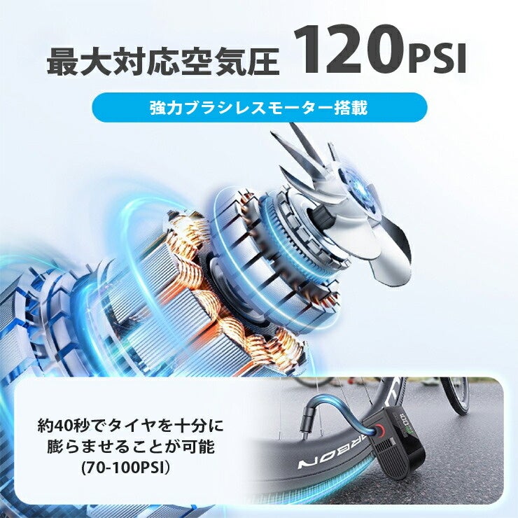 フル充電でロードバイクのタイヤで2.5本分に空気を入れることが可能です(0-100PSI)。