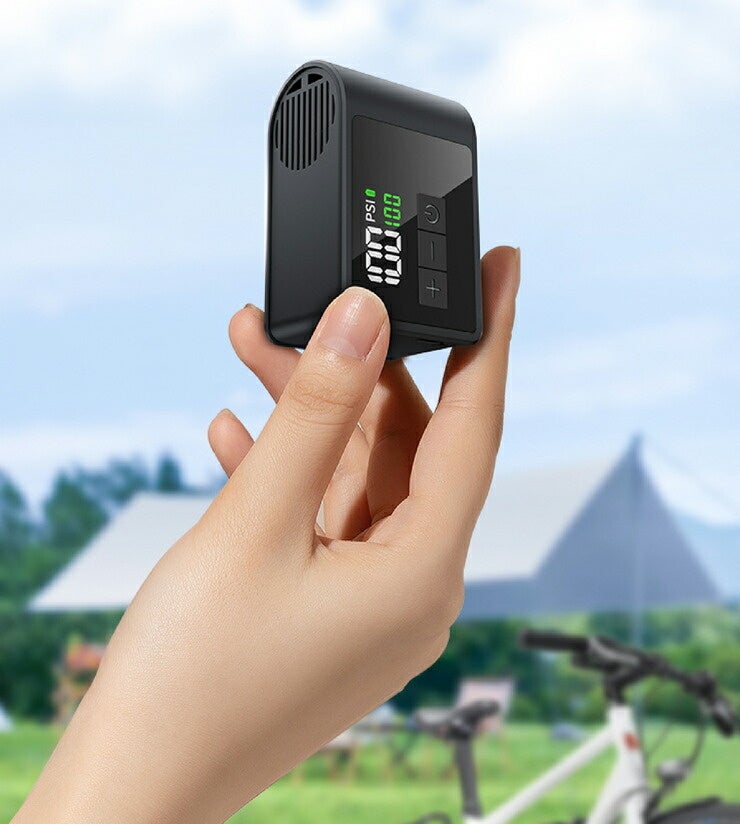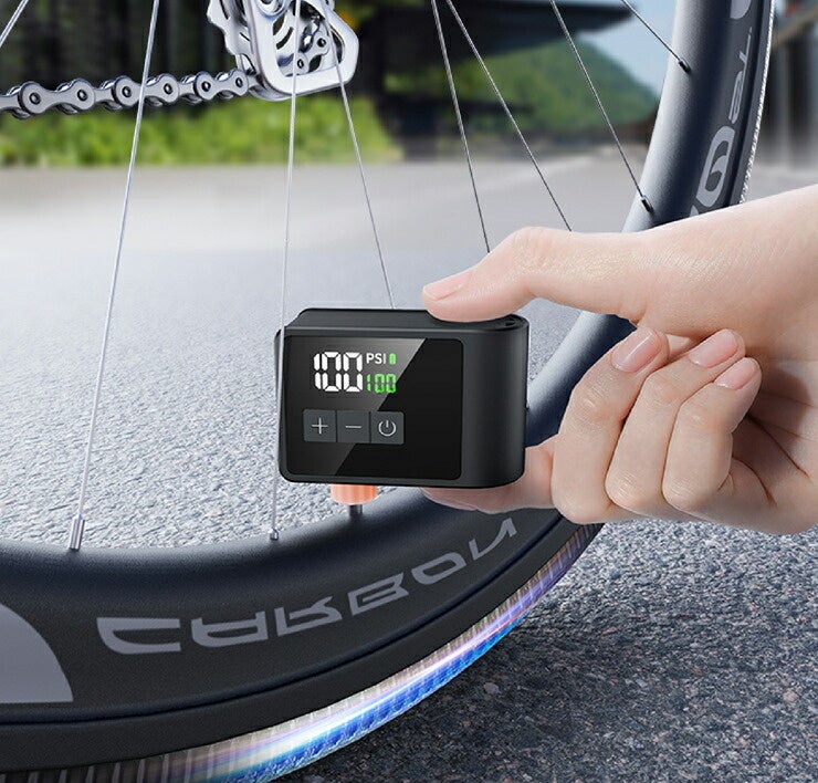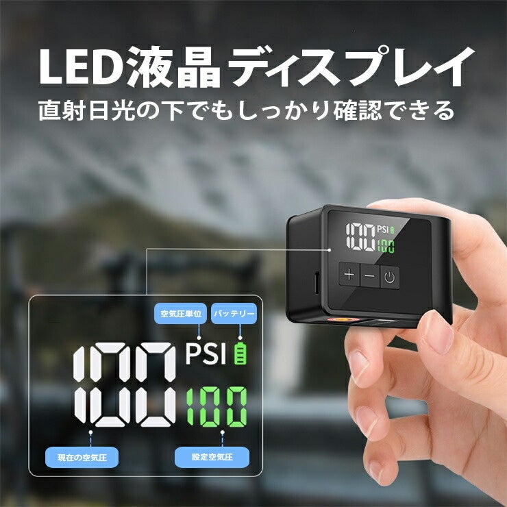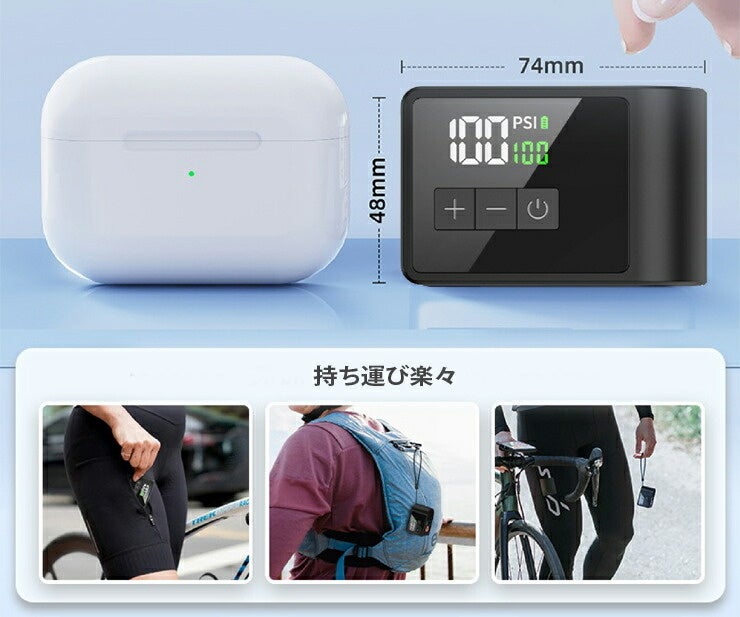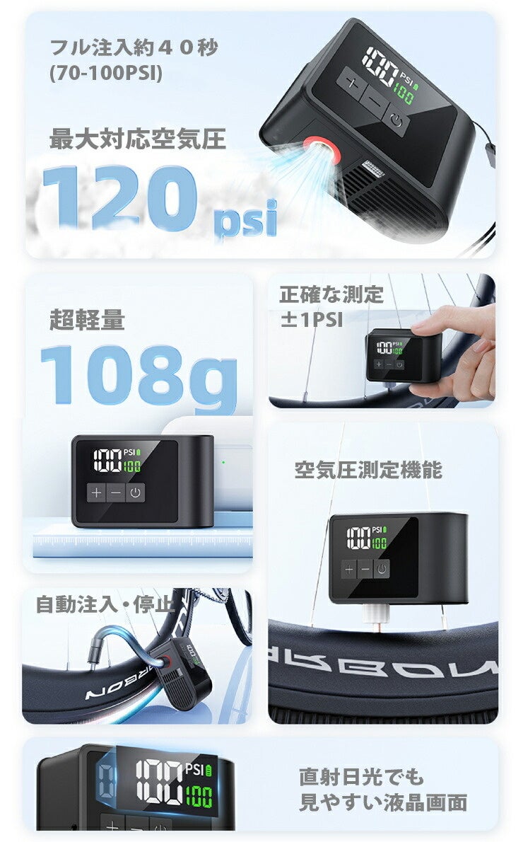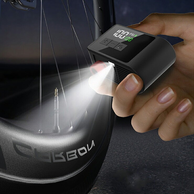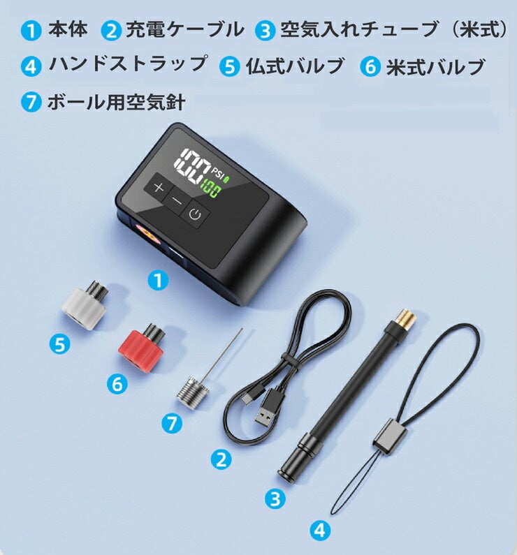 【超小型/超軽量/ディスプレイ表示/大容量バッテリー/Type-C充電/LEDライト付き/米式・仏式バルブ対応】