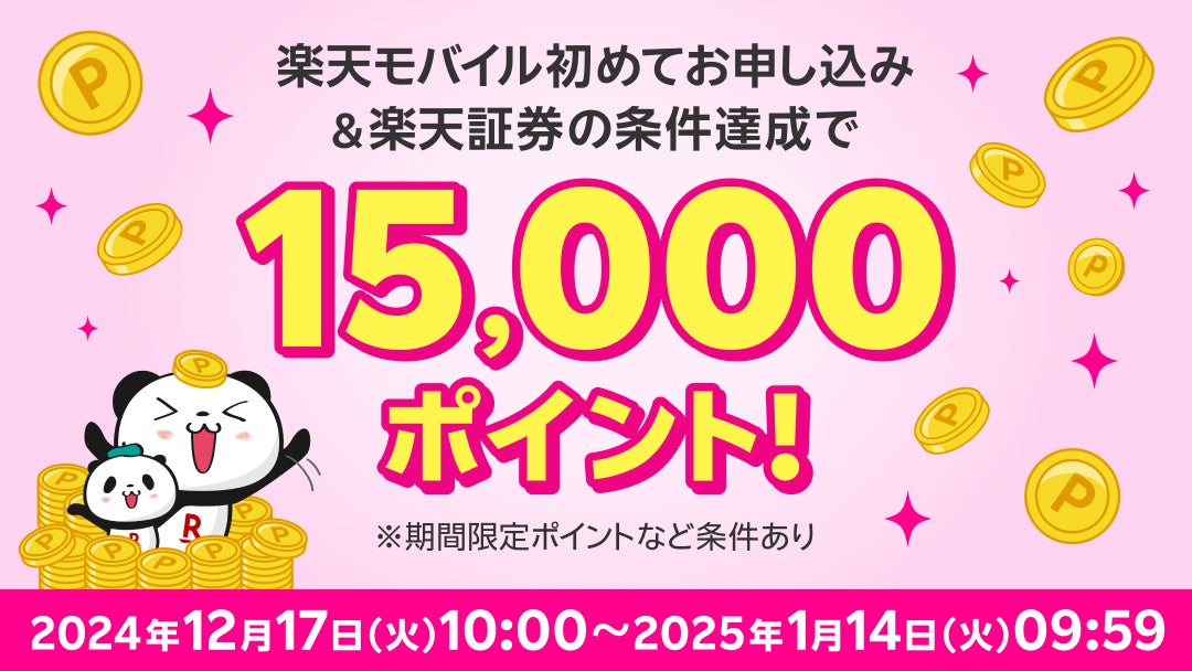 楽天モバイル株式会社(以下 「楽天モバイル」)は、本日2024年12月17日(火)午前10時から2025年1月14日(火)午前9時59分まで、「【楽天モバイル×楽天証券】条件達成で15,000ポイントプレゼント」キャンペーンを実施し、「Rakuten最強プラン」および楽天証券を初めてご利用されるお客様を対象に、「楽天ポイント」を15,000ポイント還元します(注1、2)。フィンテックサービスとの連携を強化することで、より多くのお客様がおトクに楽天モバイルおよび楽天証券の両サービスをご利用いただけるようになりました。