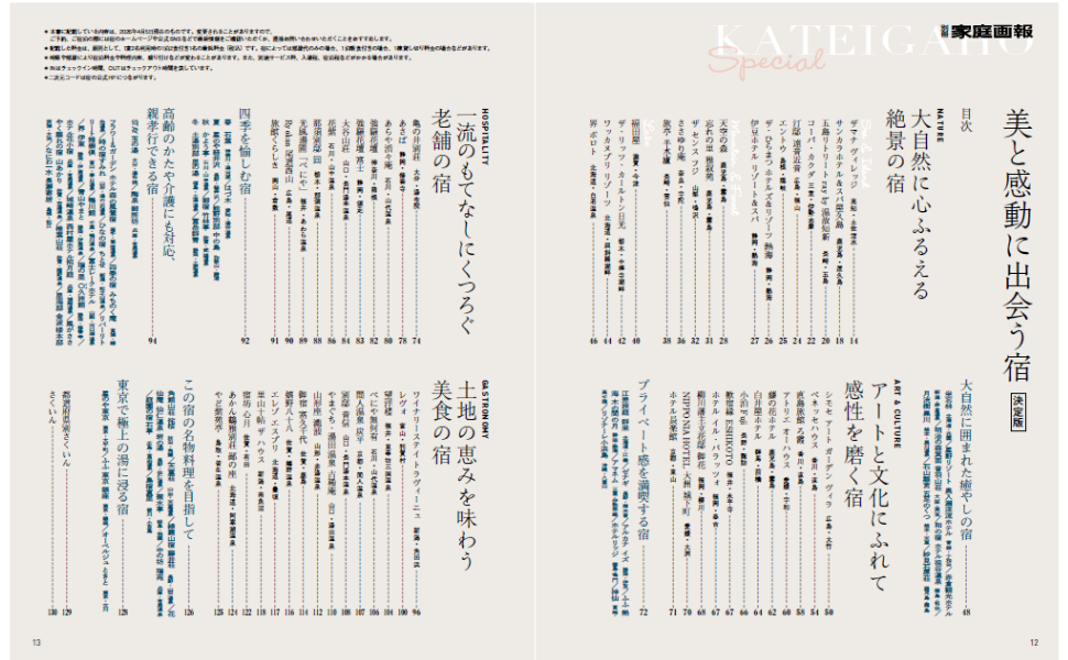 充実したコラムでは、目的やシーンに応じた宿選びのヒントをきめ細かく提案。大自然に抱かれる絶景の宿から、プライベート感あふれる隠れ家のような一軒、四季折々に訪れたい季節の宿、その一皿を求めて足を運びたくなる美食の宿。さらに、年齢を重ねても快適に旅を楽しめる、バリアフリーやユニバーサルデザインに配慮した宿も丁寧に紹介します。多様なニーズに応えながら、誰にとっても“理想の滞在”に出会える一冊です。