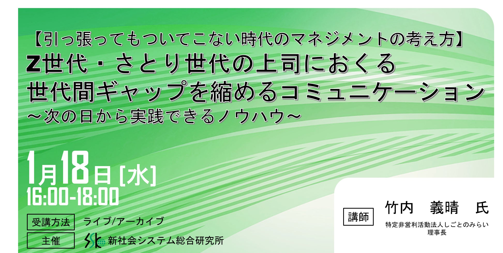 「世代間ギャップを縮めるコミュニケーション」と題して、特定非営利活動法人しごとのみらい 理事長 竹内 義晴氏のセミナーを2023年1月18日(水)に開催!!