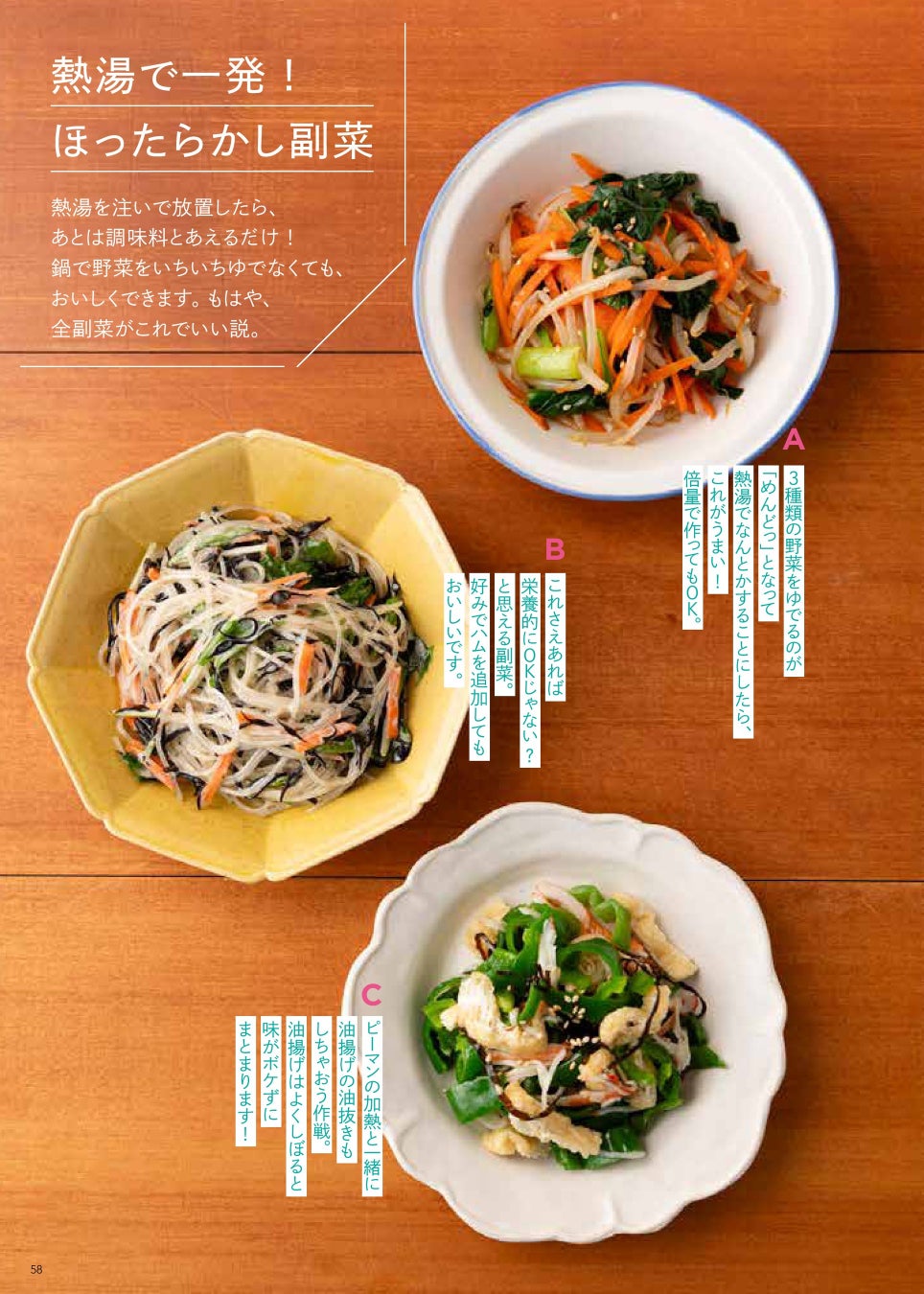 めんどうなことが大嫌い、でもおいしさには妥協しないおよねさんが家族のためによく作っているメニューをどどんと紹介。休日によく出現する麵物、新たにくり出した「熱湯ワザ」など、ぜひご注目ください。