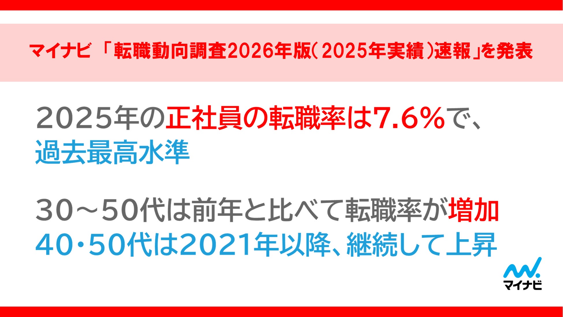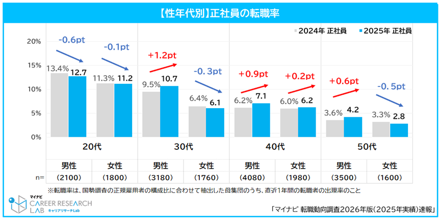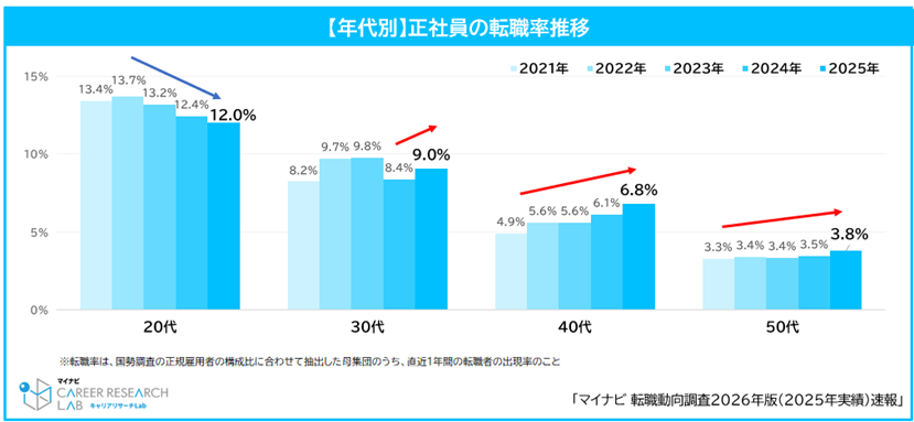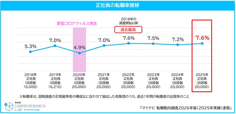 株式会社マイナビ(本社:東京都千代田区、代表取締役 社長執行役員:粟井俊介)は、全国の正社員で働く20~50代の男女2万人を対象に実施した「転職動向調査2026年版(2025年実績)速報」の結果を発表しました。