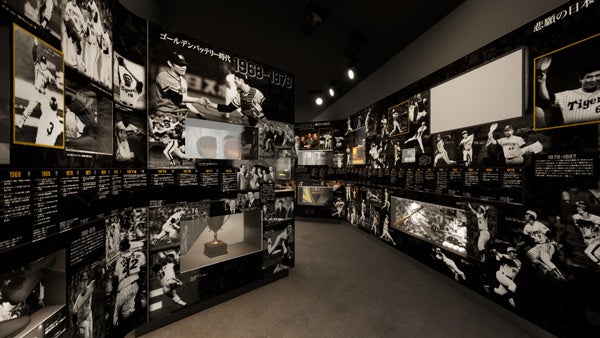 阪神タイガースの歴史を球団創設から8つの時代に分け、各時代の選手や出来事を年表に沿って紹介。写真や解説とともに展示品を壁面に埋め込むことで、展示品にまつわるストーリーをより分かりやすく、映像を通じて各時代への理解がより深まります。