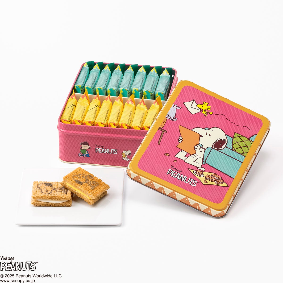 ➁誰かからお手紙が届いたスヌーピーとウッドストック。じっくり手紙を読みながら、シュガーバターの木をつまんでいる様子が可愛いオリジナルのスペシャル缶。側面までスヌーピーと仲間たちが描かれ、隅々までじっくり見たくなるデザインに仕上げました。