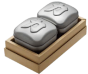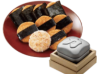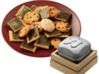 〈もち吉〉➀決まり手大煎餅(3種類)個包装9枚入 2,700円 ➁決まり手小煎餅(3種類)25枚入 2,700円※➀➁決まり手帖つき ➂決まり手煎餅(大・小)2缶セット 5,400円 ➃決まり手煎餅(大・小各2缶)4缶セット 10,800円 ➄力を贈るぞTシャツ 各5,500円/1階 案内所跡地イベントスペース