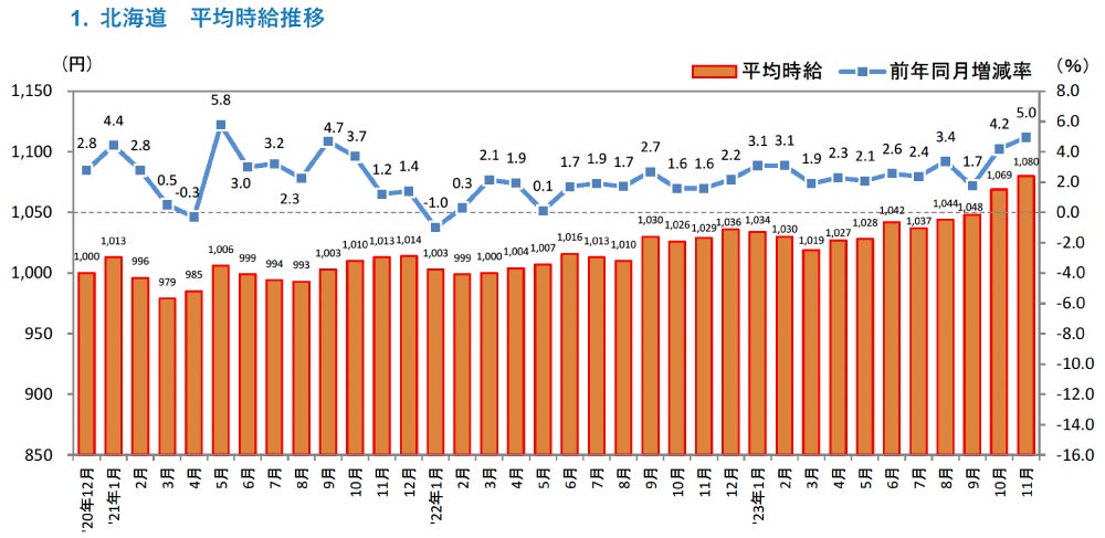 [北海道版]2023年11月度 アルバイト・パート募集時平均時給調査 北海道の11月度平均時給は前年同月より51円増加の1,080円