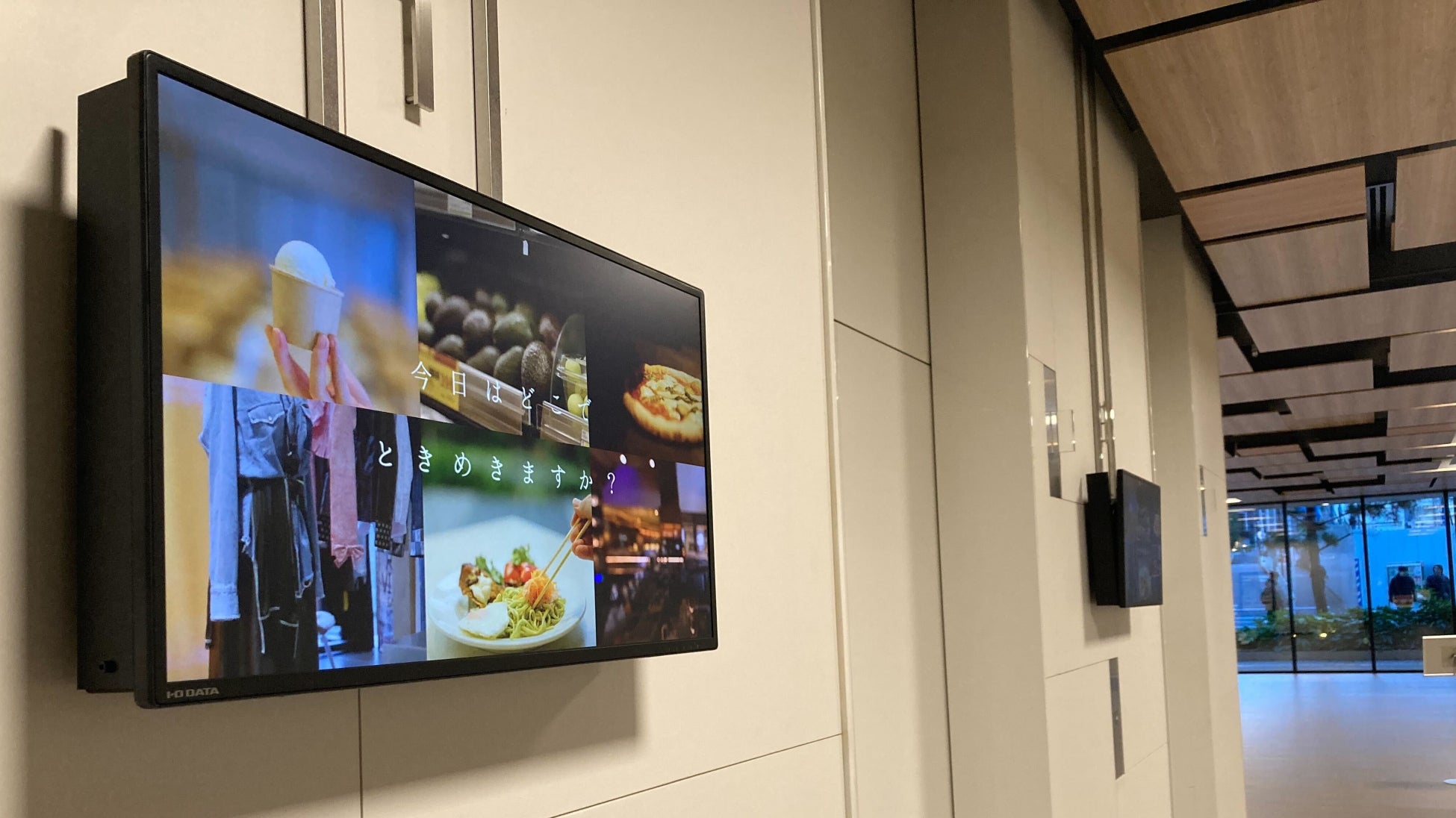 渋谷キャスト内の1Fオフィスエレベーター前、個室トイレ、喫煙所に設置されているサイネージ