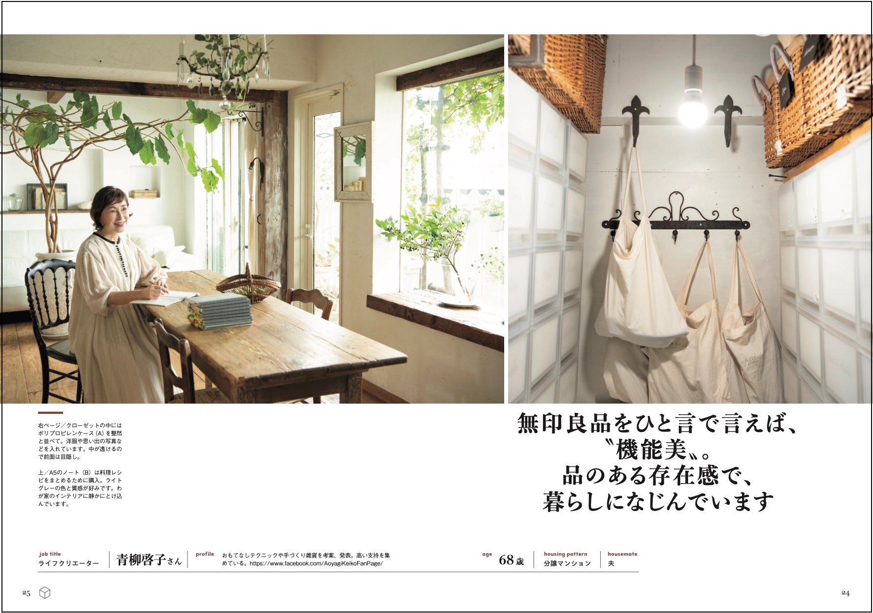 趣味から始まった手づくりがライフワークとなり、ライフクリエーターとして活躍する青柳啓子さん。子どもが独立後に大がかりなリフォームをして、夫婦ふたりでゆったり過ごせる空間を確保しました。無印良品はおもに収納アイテムを愛用しており、ポリプロプレンケースは224個も!愛用していたことが今回の取材のときにわかりました。
