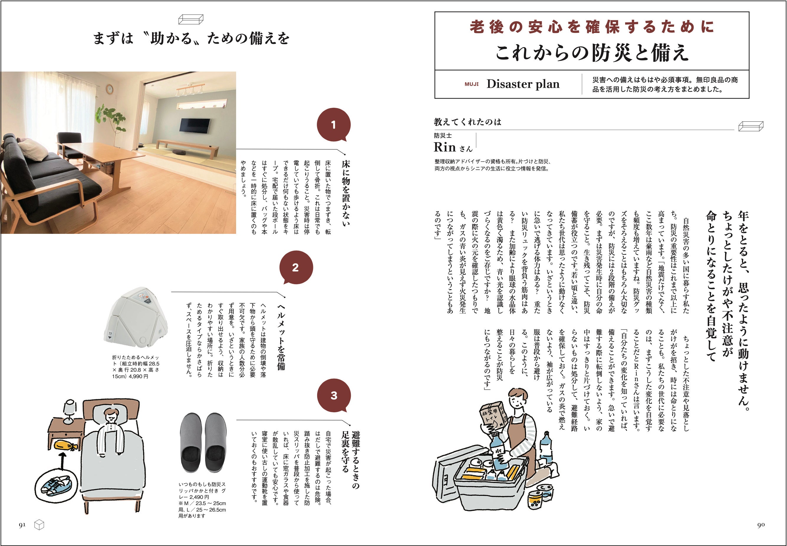 本書には、整理収納アドバイザーで防災士の資格も持つRinさんが、無印良品のアイテムを使ってもしものときの備えを指南するページもあります。「床にものは極力置かない」「避難をするときは足裏を守ろう」など、家族みんなで確認しておきたいアドバイスも掲載しています。