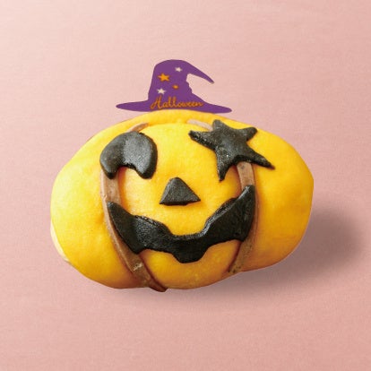 キャラメルチョコチップ入りのパンにパンプキン風味のクッキー生地を乗せ、ジャック・オ・ランタンの顔の形に焼きあげました。