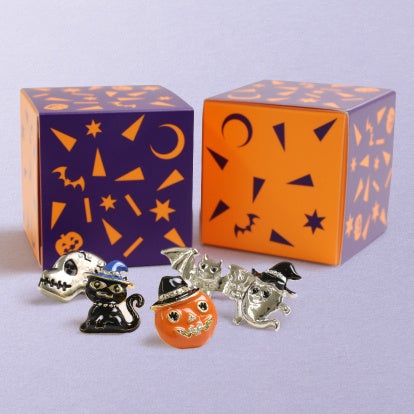 襟元を可愛らしくデコレートするハロウィンモチーフのピンズを、カボチャ・ゴースト・コウモリ・黒猫・スカルの5種類でご用意いたしました。