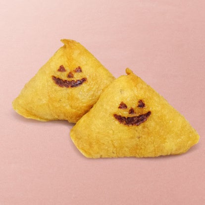 三角形の大きなおいなりさんに、かぼちゃのオバケの顔を焼印。お揚げの中には寿司飯とパンプキンサラダを詰め込みました。