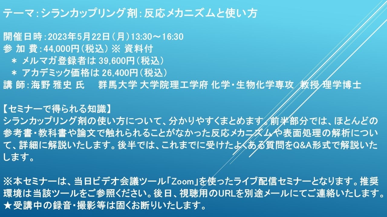 先端技術情報や市場情報を提供している(株)シーエムシー・リサーチ(千代田区神田錦町: https://cmcre.com/ )では、 各種材料・化学品などの市場動向・技術動向のセミナーや書籍発行を行っておりますが、 このたび「シランカップリング剤:反応メカニズムと使い方」と題するセミナーを、 講師に海野 雅史 氏 (群馬大学 大学院理工学府 化学・生物化学専攻 教授 理学博士)をお迎えし、2023年5月22日(月)13:30より、 ZOOMを利用したライブ配信で開催いたします。 受講料は、 一般:44,000円(税込)、 弊社メルマガ会員:39,600円(税込)、 アカデミック価格は26,400円(税込)となっております(資料付)。